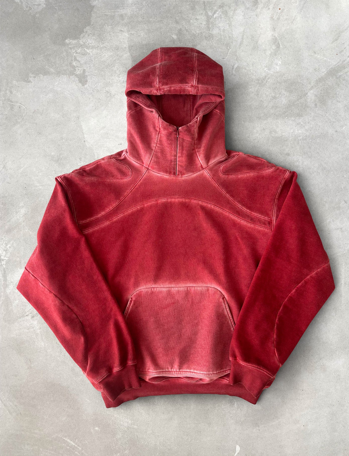 The Oxide Red Hoodie features a 100% Cotton French Terry with a paneled construction and a high neck hood. The hoodie has been garment-dyed creating subtle contouring along the seams.